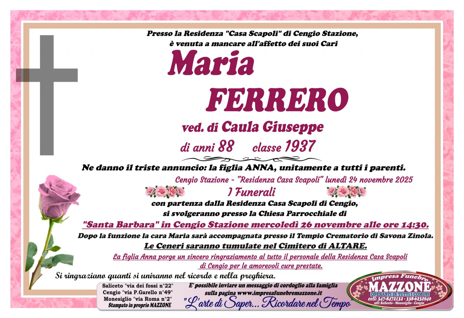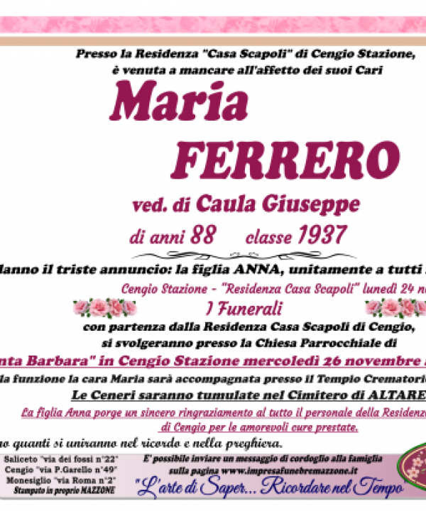 Lascia gratuitamente un messaggio di cordoglio, sarà nostra cura consegnarlo ai congiunti di Maria Ferrero.
